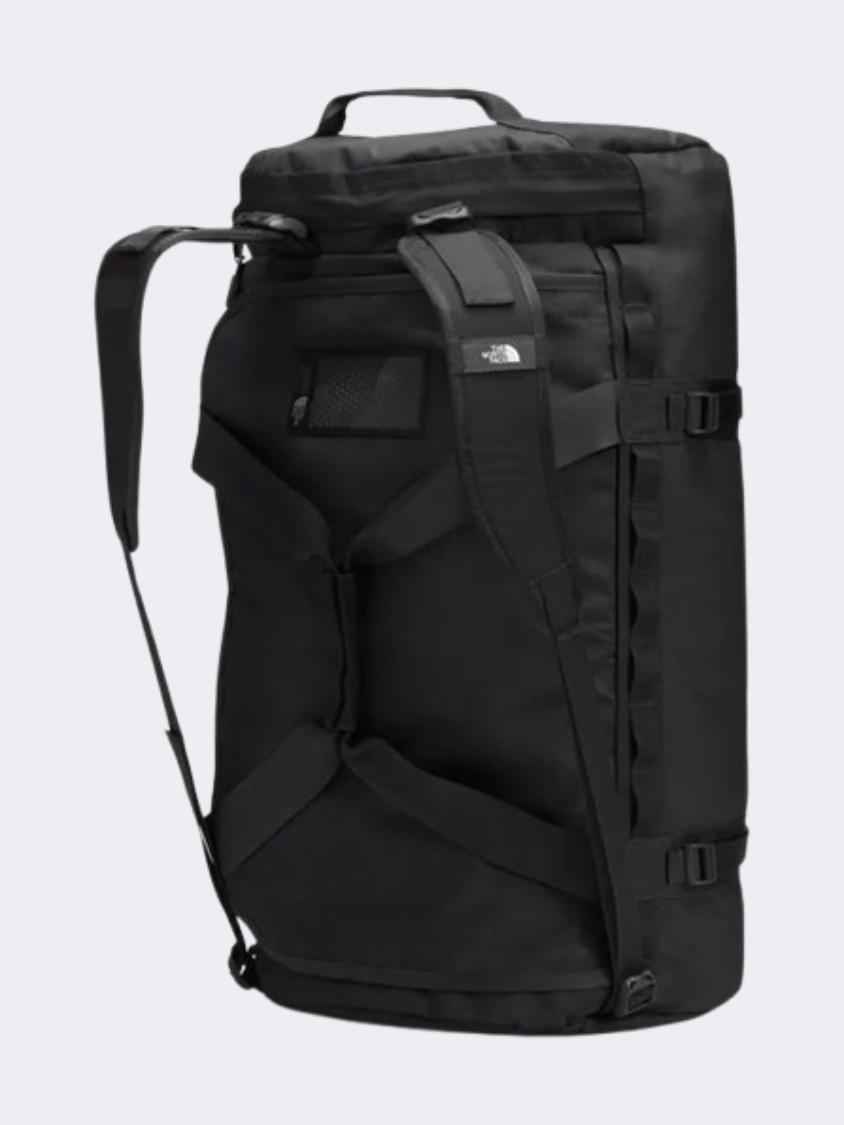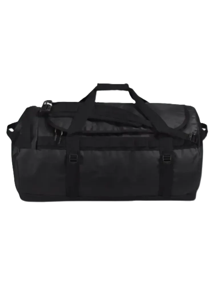 Base Camp Duffel Large, made from a black water-repellent laminate fabric with PFC-free ballistic nylon details, both recycled. It can be used as a duffel bag with the double ergonomic handles, or carried as a backpack, thanks to the removable and adjustable padded shoulder straps.